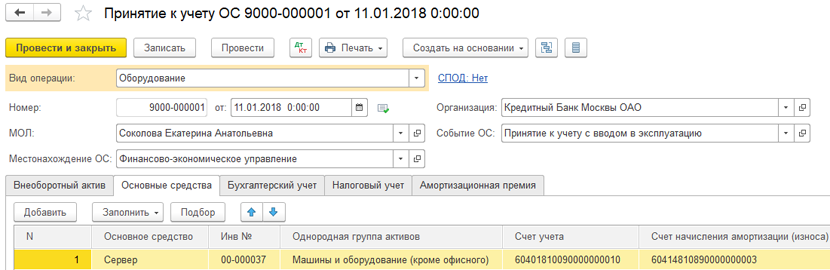 Учет основных средств и нематериальных активов реализован в соответствии с действующим Положением N 448-П «О порядке бухгалтерского учета основных средств, нематериальных активов, недвижимости, временно неиспользуемой в основной деятельности, долгосрочных активов, предназначенных для продажи, запасов, средств труда и предметов труда, полученных по договорам отступного, залога, назначение которых не определено, в кредитных организациях», а также законодательством Российской Федерации. Аналитический учет ОС и НМА ведется по подразделениям эксплуатации и материально-ответственным лицам. Автоматизированы основные операции по учету: