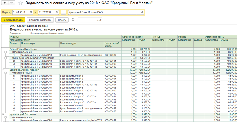 Рисунок 5. Ведомость по внесистемному учету