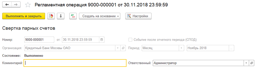 Для выполнения свертки используется документ «Свертка парных счетов расчетов с контрагентами». При проведении документа выполняются операции: