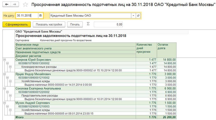 Рисунок 7. Отчет «Просроченная задолженность подотчетных лиц»