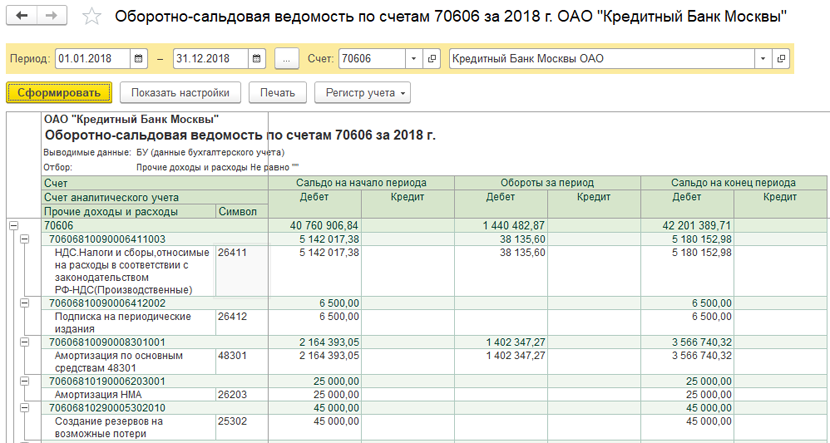 Рисунок 8. Оборотно-сальдовая ведомость по счету 70606 «Расходы»