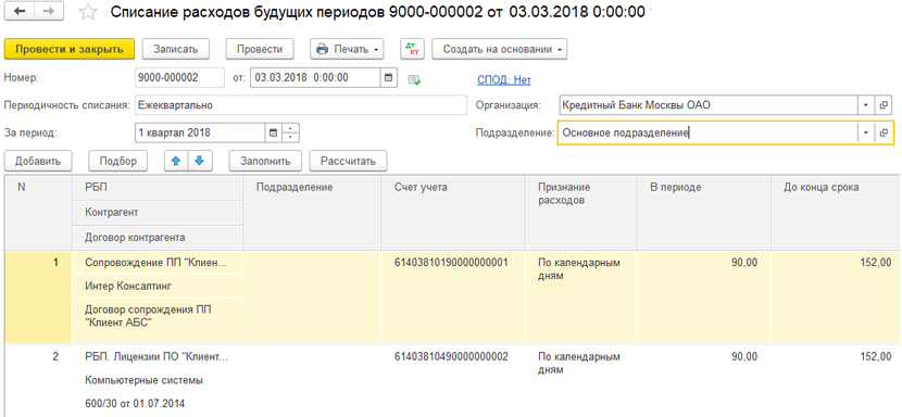 Списание расходов будущих периодов в расходы осуществляется регламентным документом «Списание расходов будущих периодов».